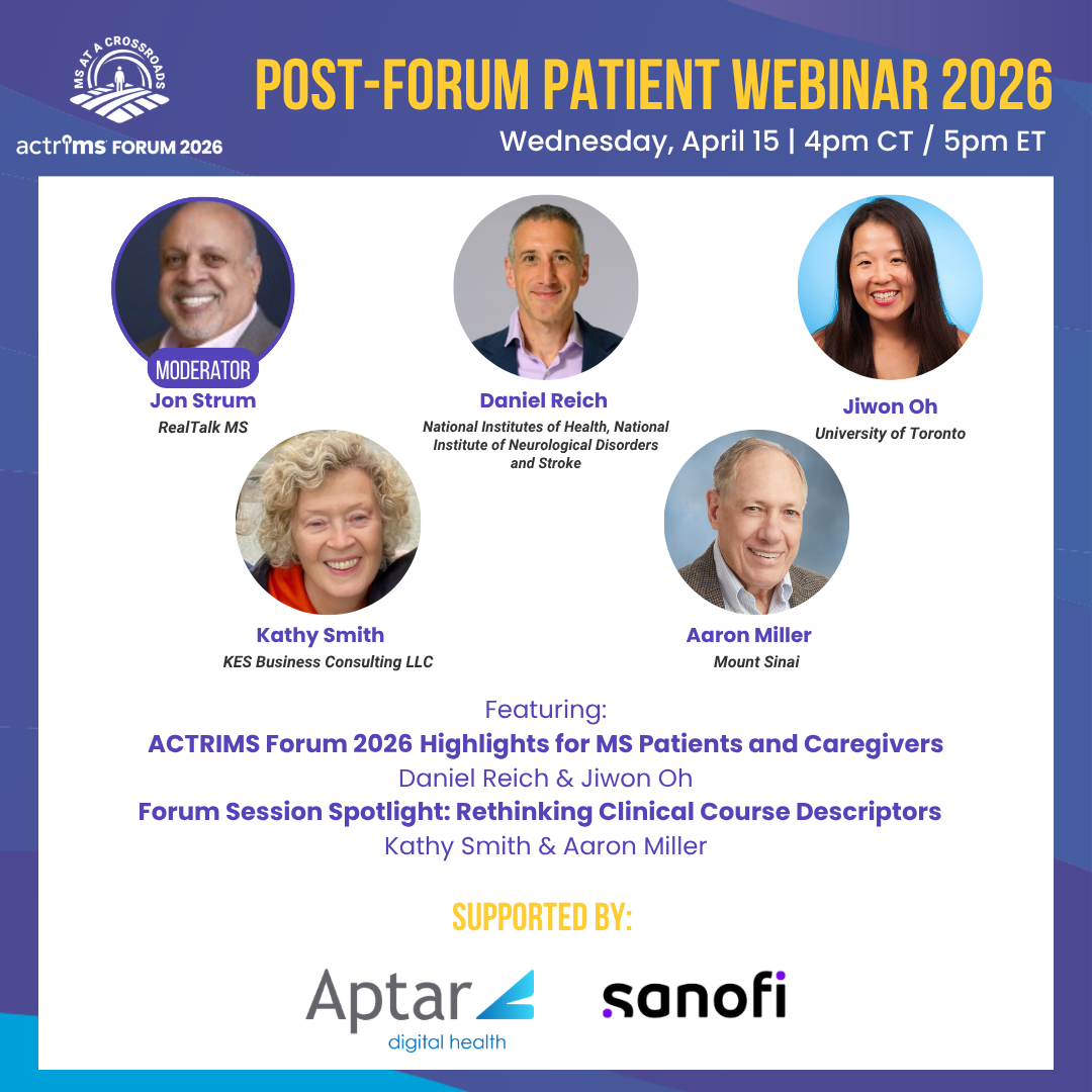 2026 WebinarsAI in MS Patient Care and ResearchLearn from leading experts as they discuss how AI is transforming MS diagnosis, disease monitoring, and personalized treatment, as well as accelerating research and clinical trials. Learn what AI means for patients, from improving clinical visits and prognostic tools to advancing MRI analysis and expanding access to new therapies. ACTRIMS Forum 2025: Making Connections - Researchers, Clinicians, and Those Living with MSDiscover key insights from the ACTRIMS Forum 2025 as experts discuss groundbreaking research on aging in MS, MRI assessments, and therapy discontinuation in older adults. 2024 WebinarsDiet in MS: Current and Future DirectionsHosted by ACTRIMS and the National MS Society Learn from leading experts in neurology, nutrition, and wellness about current studies and how dietary choices impact MS symptoms and management. ACTRIMS Forum 2024: Breaking Communication Barriers Between MS Clinicians & Researchers and People Living with MSACTRIMS launched its first Post-Forum Patient-Centered Webinars on March 13 & 20, 2024. The webinars titled "Breaking Communication Barriers Between MS Clinicians & Researchers and People Living with MS," featured invited speakers from ACTRIMS Forum 2024 who shared highlights of their presentations and research from the perspective of "what this means for people living with MS." Thank you to our speakers, moderators and all attendees for making these webinars a successful step forward in bridging the gap between researchers and people living with MS. |